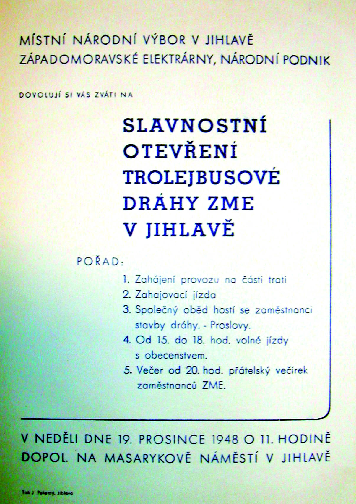 Plakát k slavnostnímu otevření trolejbusové dráhy v Jihlavě 19. prosince 1948. Foto: Poskytl Stanislav Jelínek „Průvodčí seděl v kukani za zadními dveřmi a prodával jízdenky po padesáti haléřích. Jízdenku z bločku tahal gumičkou na kleštičkách a pak ji procvakl. Trolejbusy měly lavice při stěnách a bylo na nich pořád natřískáno. Lidi se hrozně tlačili,“ připomněl pamětník Jiří Bartoš.