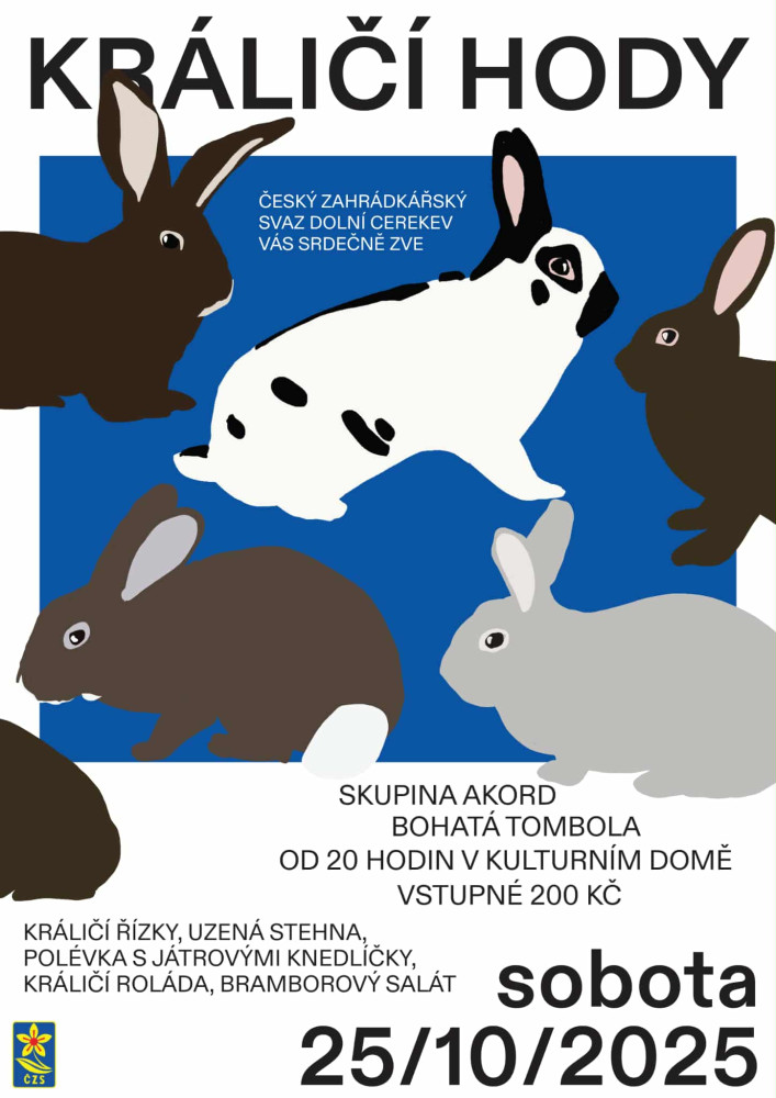 Svaz zahrádkářů a chovatelů v Dolní Cerekvi zve na tradiční akci - Králičí hody. Ty se budou konat v sobotu 25. října od 20:00 v kulturním domě. Připraveno bude bohaté občerstvení a tombola. Hraje kapela Akord.