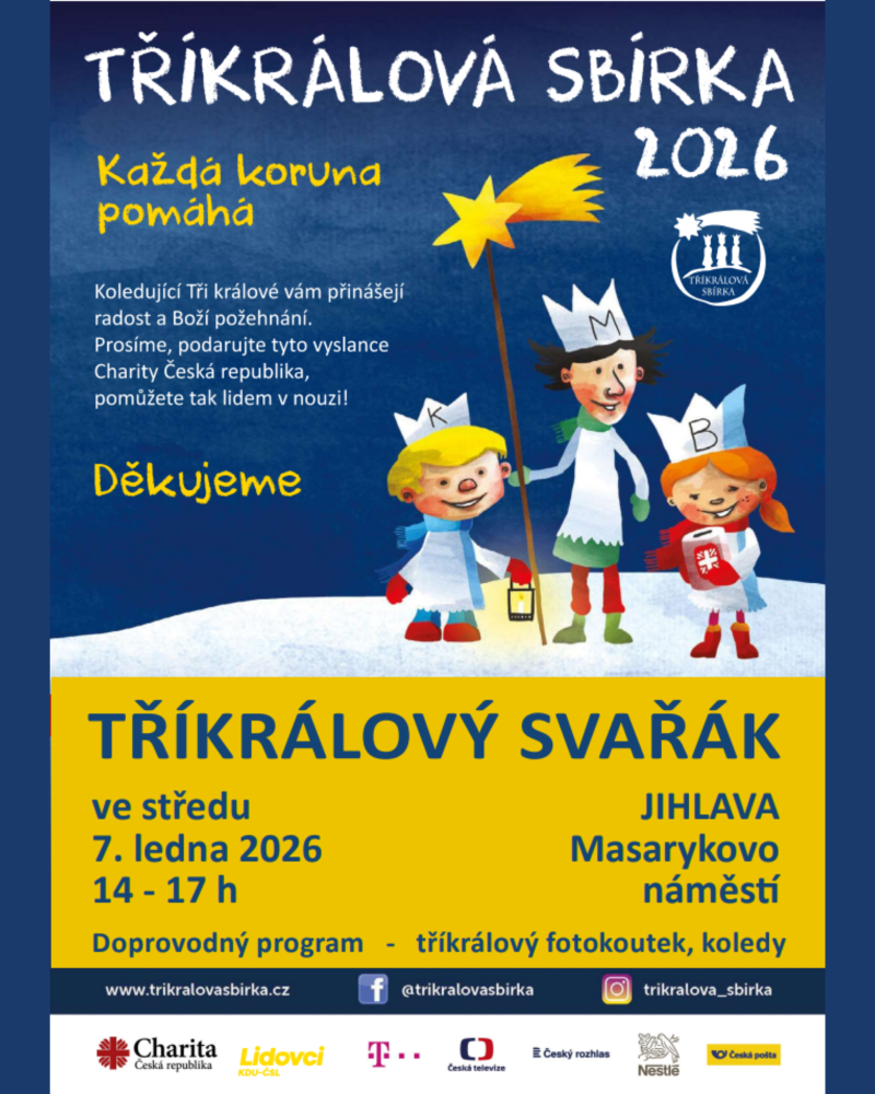 KDU Jihlava ve spolupráci s ODS Jihlava pořádá tradiční Tříkrálový svařák na Masarykově náměstí v Jihlavě. Tři králové Vám za dobrovolný příspěvek do Tříkrálové sbírky nabídnou výborný svařák, a to ve středu 7. 1. 2026 od 14h do 17h. Pro děti je připraven horký nápoj a také fotokoutek.