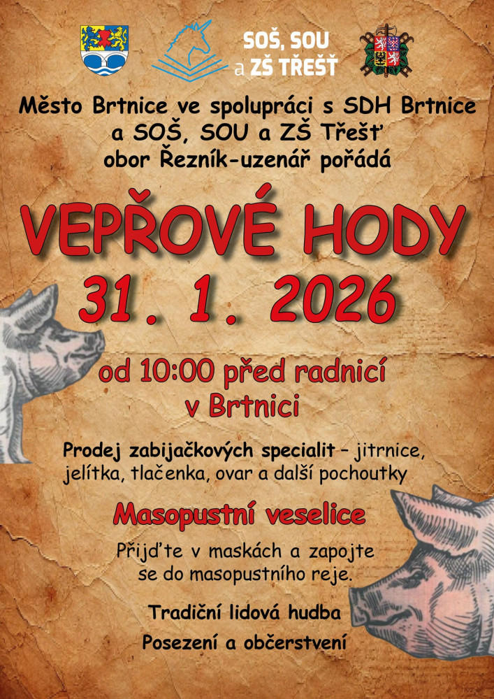 Město Brtnice a obor Řezník- uzenář SOŠ SOU Třešť pořádají Vepřové hody a masopustní veselici.
