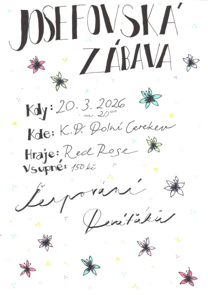 V pátek 20. března proběhne v kulturní domě v Dolní Cerekvi tradiční Josefovská zábava. V rámci zábavy proběhne šerpování deváťáků z místní školy. Zahraje kapela Red Rose.
