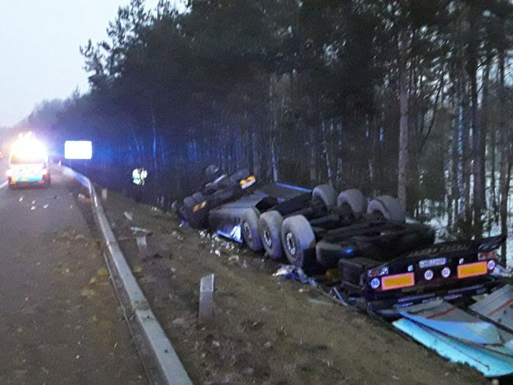 U dálničního sjezdu na Jihlavu se převrátil kamion s kukuřicí, došlo k masivnímu úniku nafty