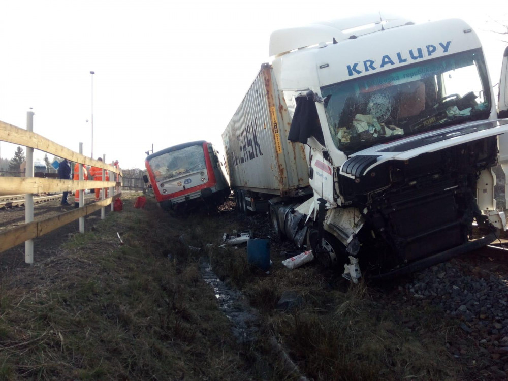Vrtulník musel zasahovat u ranního střetu vlaku s kamionem. Do půdy unikla nafta