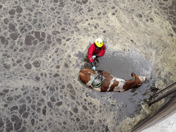 Čtyřhodinová šichta s dobrým koncem. Hasiči zachránili v Kameničce krávu, která spadla do jímky