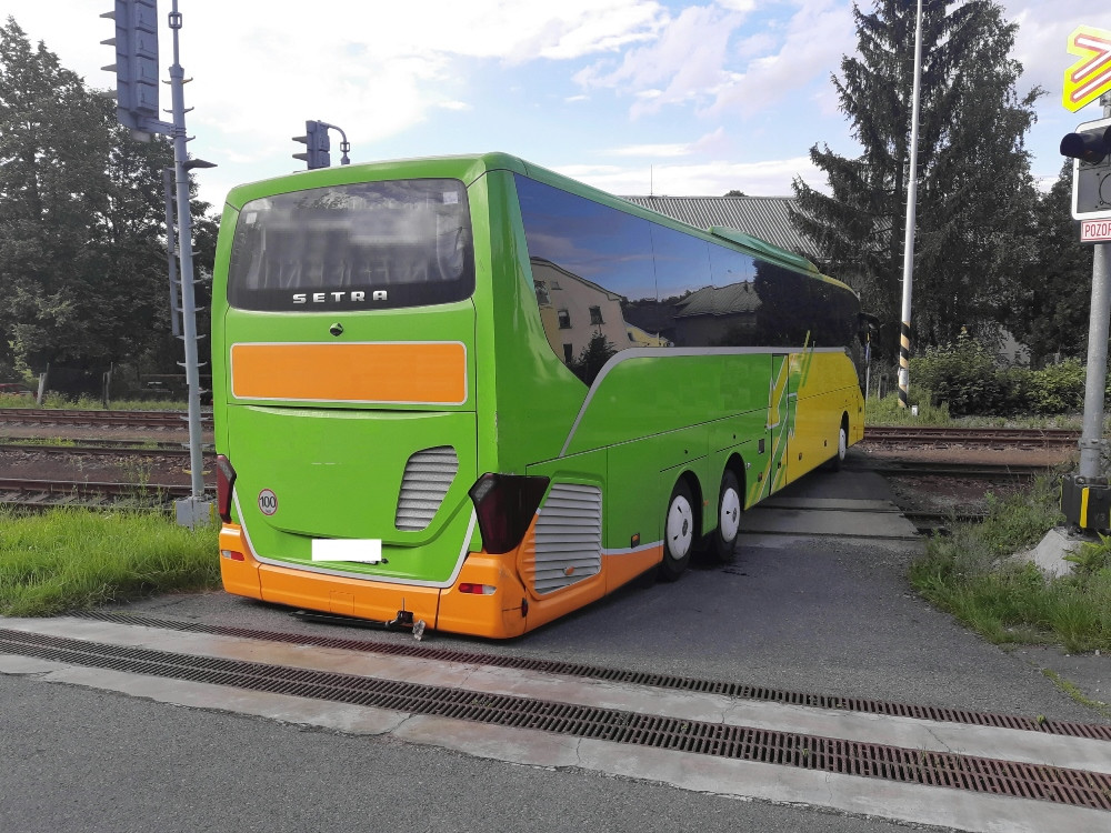 Řidič autobusu se chtěl vyhnout komplikacím na dálnici, tak z ní sjel. Uvízl ale na přejezdu
