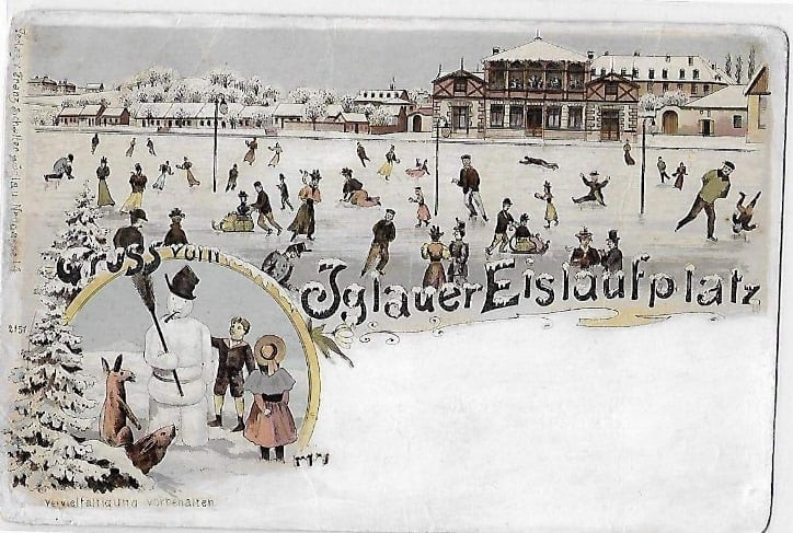 Na pohlednici z roku 1900 je zamrzlý Koňský rybník pojmenován jako Iglauer Eislausfplatz, tedy Jihlavské kluziště. Zdroj: Archiv J. Okáče