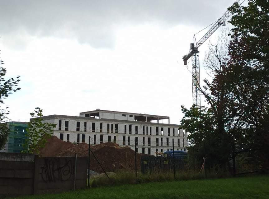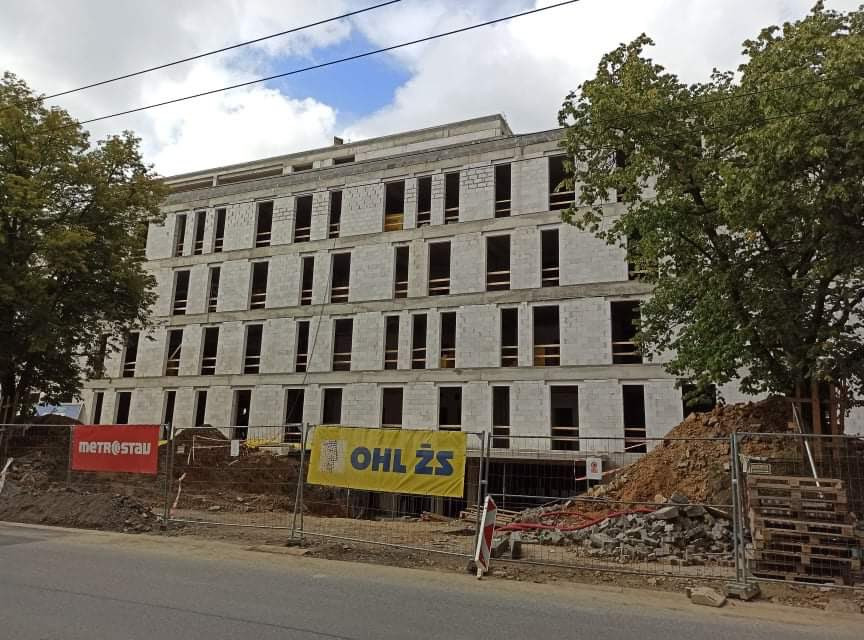 FOTO: Dělníci staví poslední patro vysokoškolských kolejí, soudní spory pokračují více...