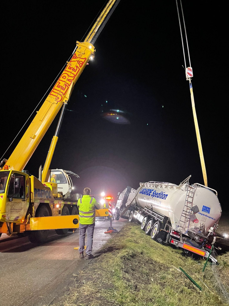 Havarovanou cisternu na D1, která vezla mléko, se před půlnocí podařilo vyprostit