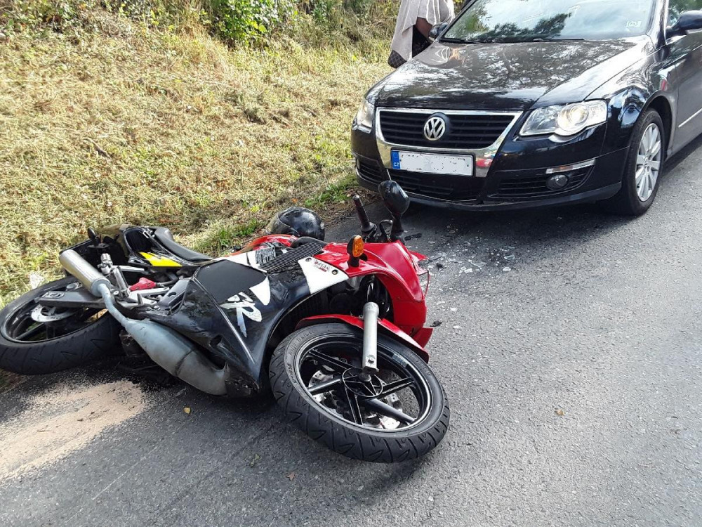 Střet osobáku s motorkou skončil zraněním. Na místě zasahovaly dvě jednotky hasičů