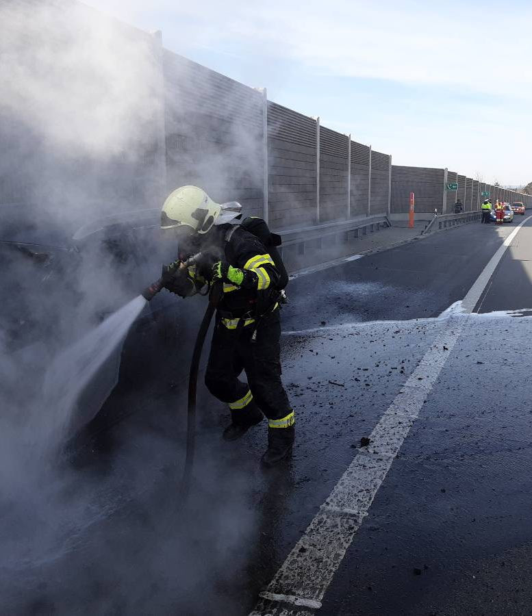 Na D1 u Věžnice hořelo osobní auto. Dálnice ve směru na Brno byla kompletně uzavřena