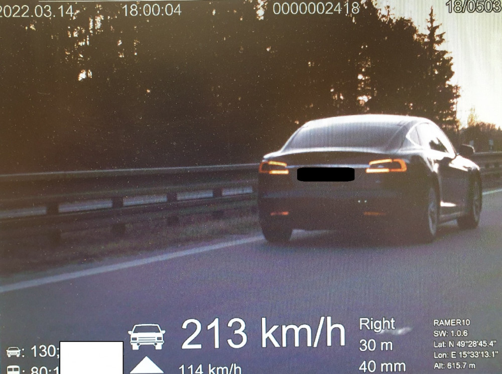 Z D1 závodní dráha. Řidiči v Tesle se na tachometru ukázalo 213km/h, hrozí mu pokuta a zákaz řízení
