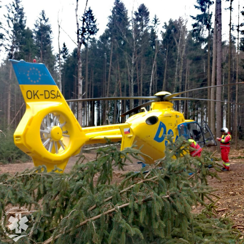 Vrtulník dnes letěl do lesa ke zraněnému muži. Během kácení na něj spadla větev