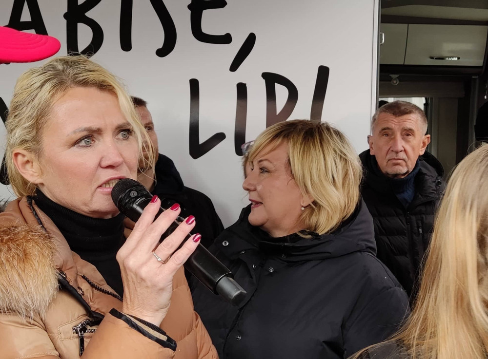 Nagyová s Babišem v rámci předvolebního turné navštívili i Jihlavu. Přivítal je déšť i hlasití odpůrci