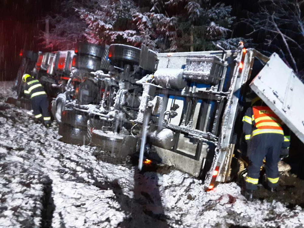 FOTO: Uvízlé kamiony, popadané stromy. Dopravu v kraji komplikuje sníh, stalo se už několik nehod