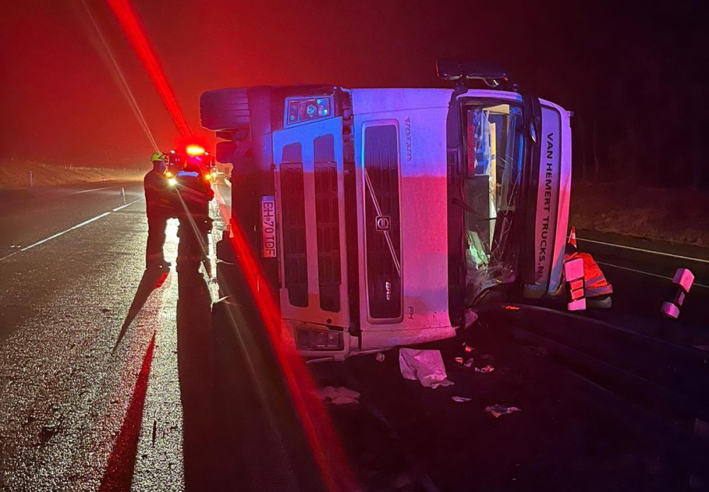Na dálnici se do středových svodidel převrátil kamion, provoz na 161. kilometru je v obou směrech omezen