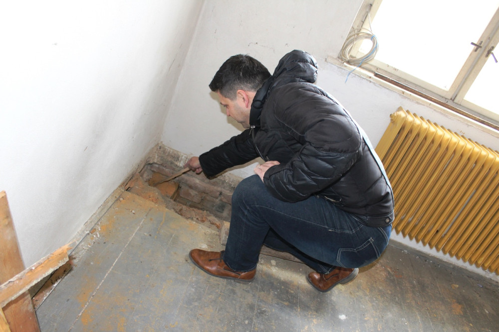 Starosta Zdeněk Dvořák u sondy, která odhalila špatný stav podlah