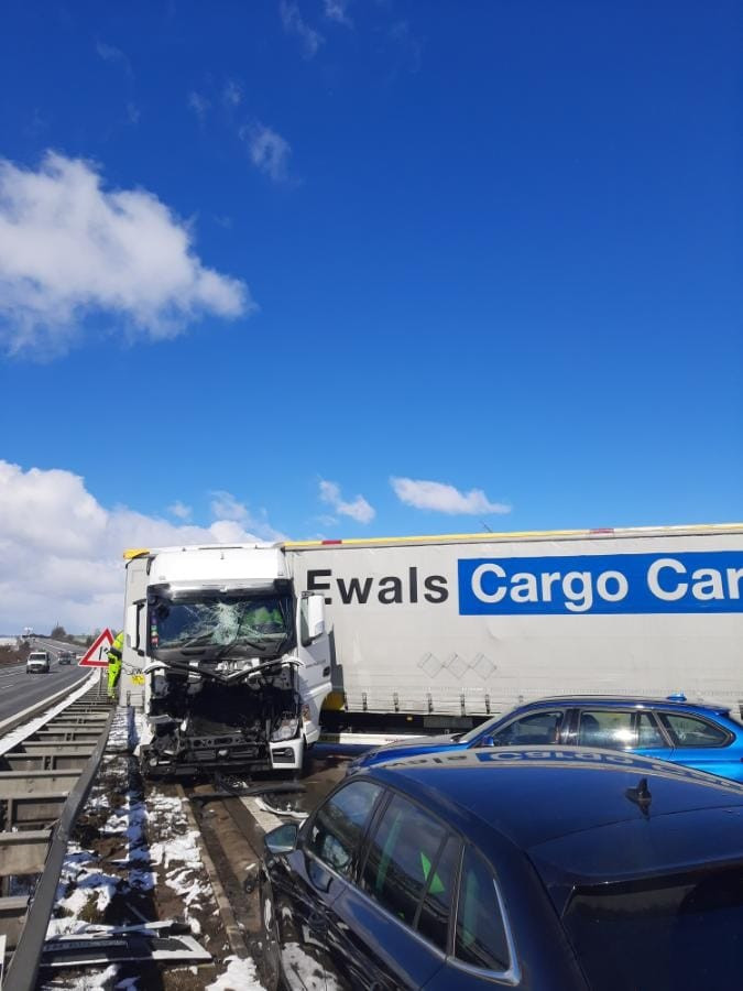 Na dálnici se srazilo dvacet vozidel, z toho pět kamionů. Řidiči už teď projedou jedním jízdním pruhem