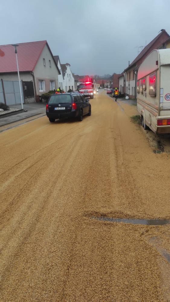 FOTO: Pivaři zapláčou. Mezi Cerekví a Kostelcem se vysypal ječmen na slad, silnice místy nebyla vidět