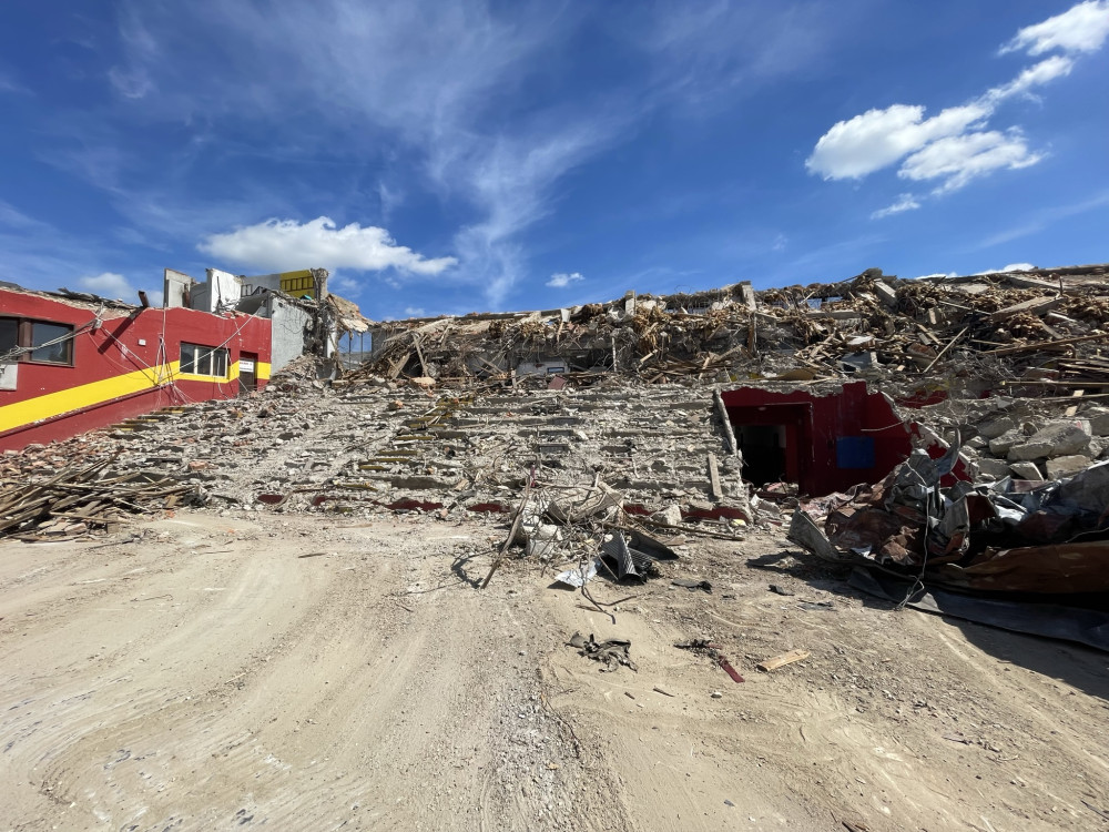 Demolice probíhá rychleji, než se čekalo. Je probourán vjezd u bývalé posilovny, na stadion se ještě vrátí archeologové