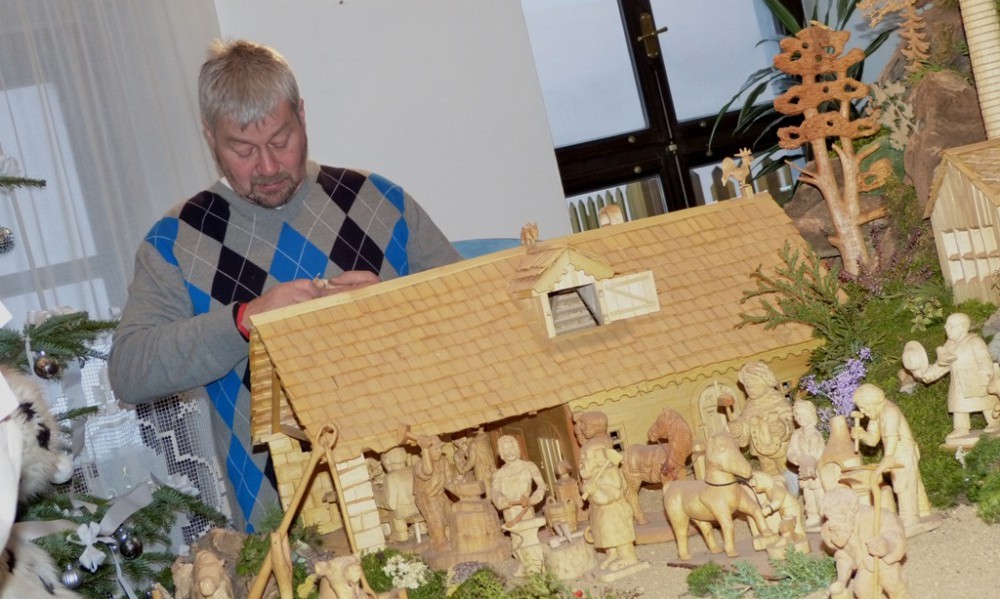 Řezbář Evžen Hamták při vyřezávání jedné z postav v Schumpeterově domě