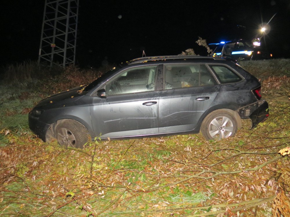 Řidič s 1,5 promile vyjel ze silnice a skončil v příkopu. Se spolujezdcem od nehody odešli, vypátral je psovod