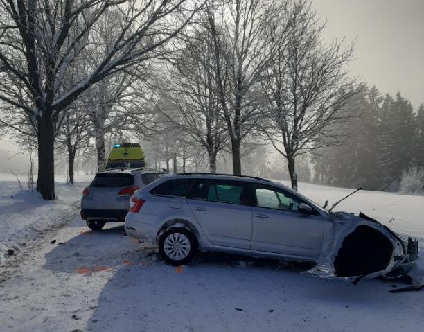 Řidič dostal v zatáčce smyk a narazil do auta v protisměru. Dva lidé se zranili, škoda je 400 tisíc
