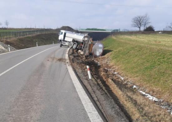 Komplikace na obchvatu Lukavce. Řidič vezl mléko a utrhla se s ním krajnice