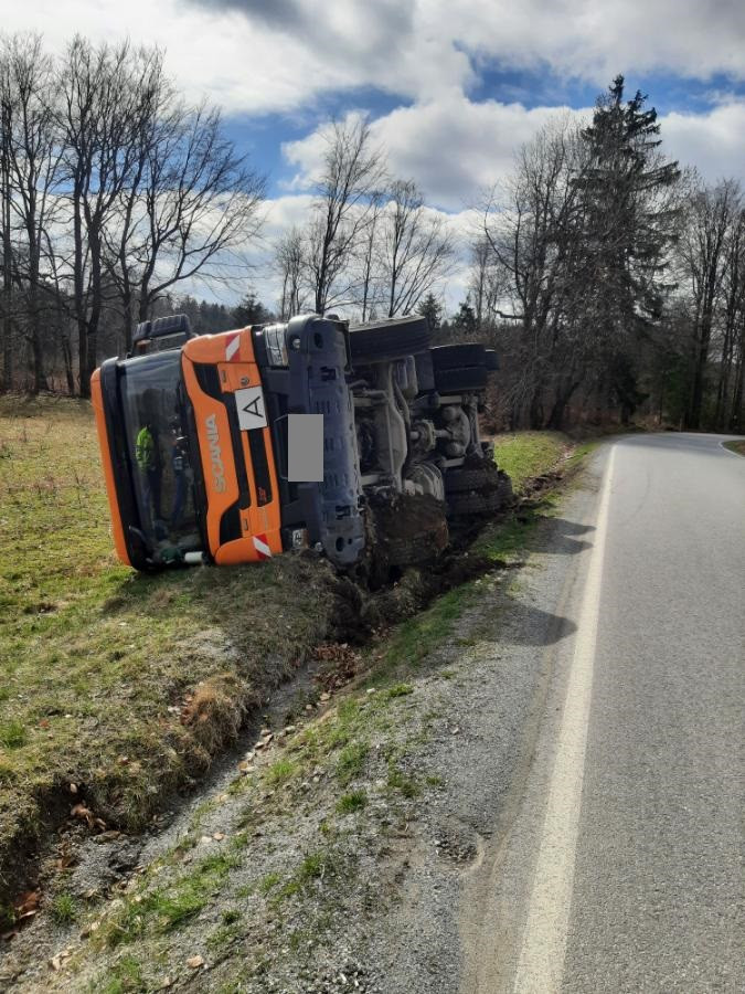 Nehoda na Jihlavsku. Řidič náklaďáku se lekl přebíhající zvěře, strhl řízení a skončil na poli na boku