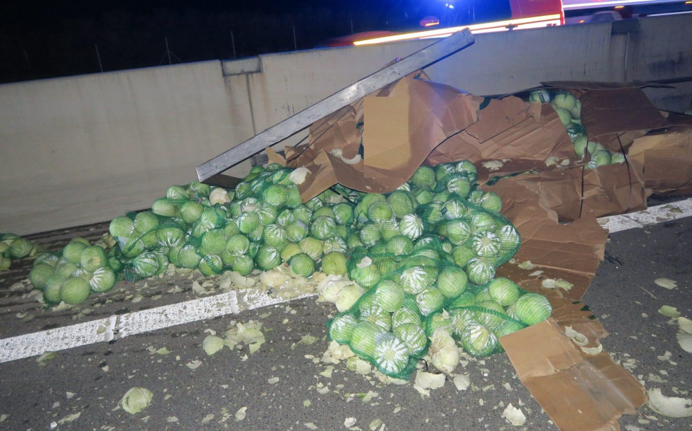 Provoz na D1 omezila nehoda náklaďáku. Po nárazu se na dálnici vysypala zelenina