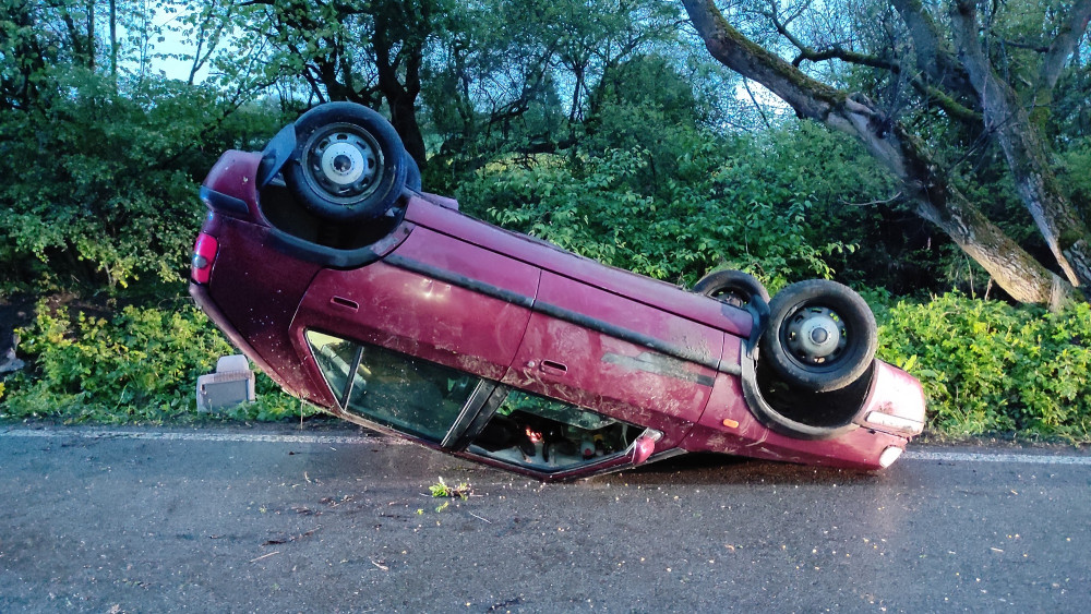 Kuriózní nehoda: U Telče bylo v sobotu ráno auto na střeše, řidič z místa utekl