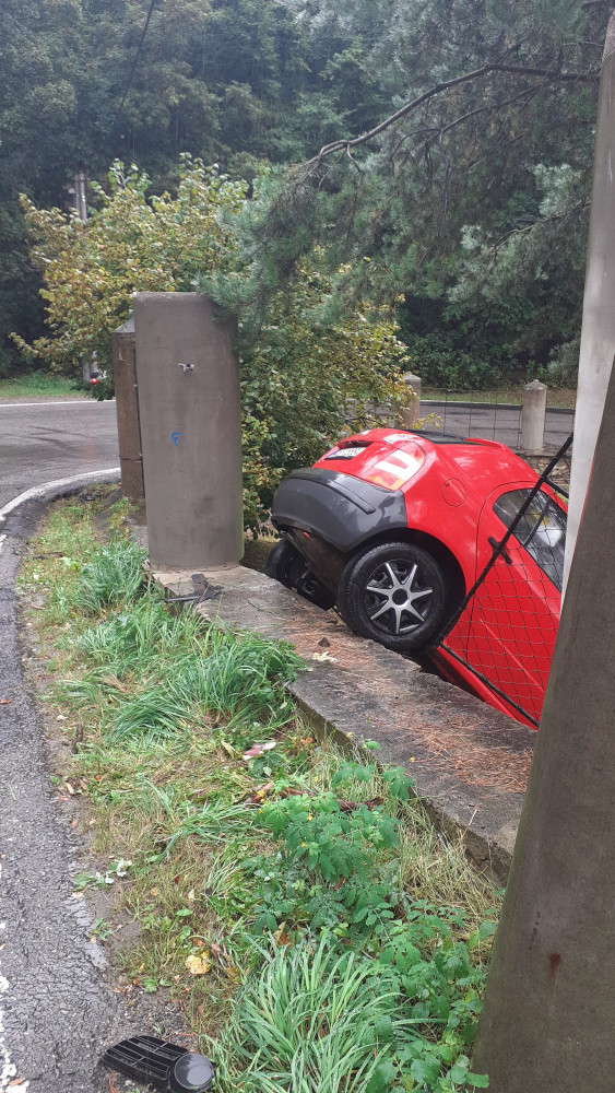 Řidič za volantem Škody Fabie prorazil oplocení u zámeckého parku a zůstal viset nad srázem. Foto: se souhlasem Policie ČR