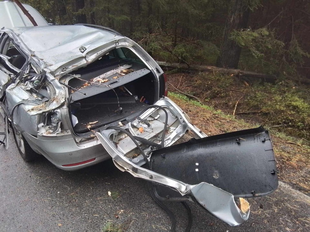 V Kostelní Myslové spadl strom na projíždějící auto. Města mají situaci pod kontrolou. Foto: se souhlasem Hasičského záchranného sboru Kraje Vysočina