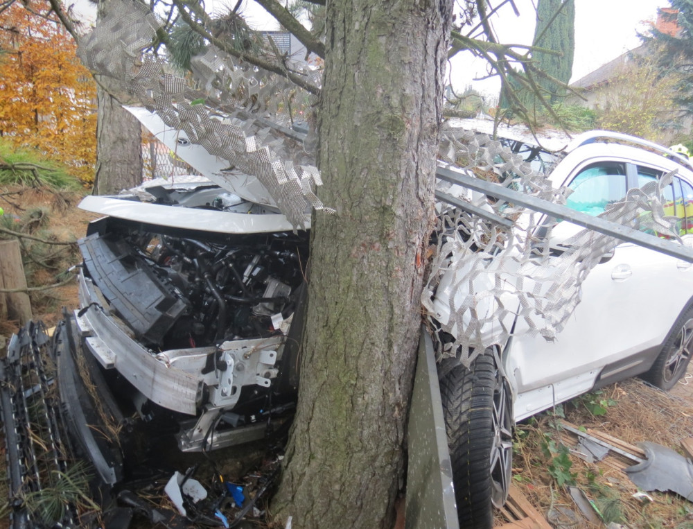 Řidička se zřejmě nevěnovala řízení, s mercedesem projela plotem na zahradu. Foto: se svolením Policie ČR