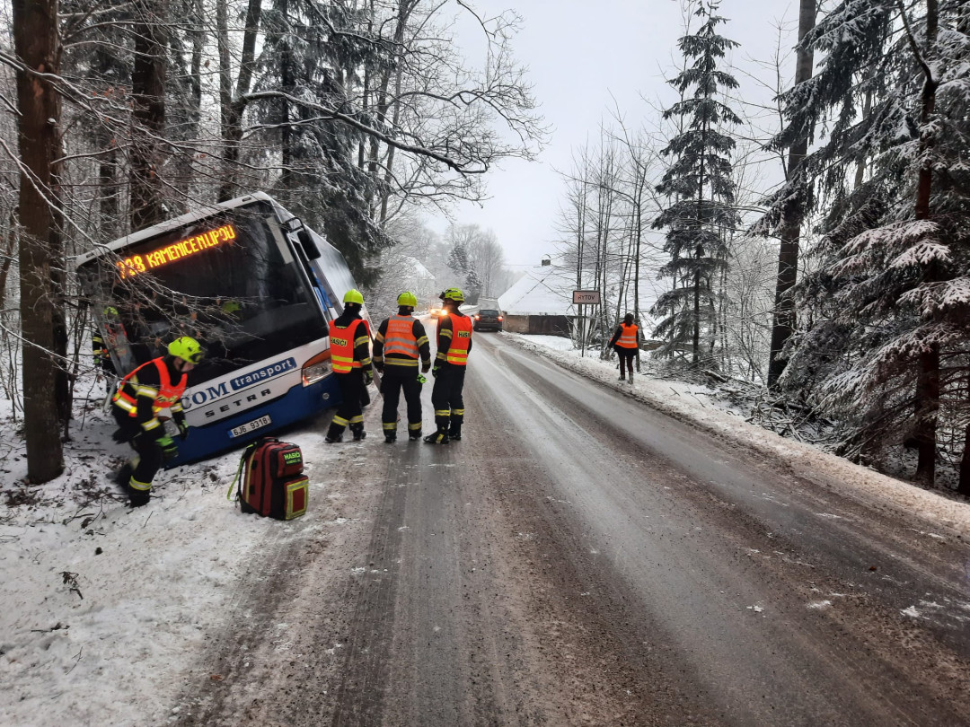 Výstraha pro řidiče: Silnice na Vysočině jsou kluzké, na Pelhřimovsku havaroval autobus