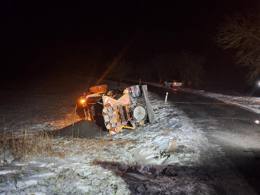 Na Havlíčkobrodsku havaroval sypač. Jeho řidič na zledovatělé silnici nezvládl projet zatáčkou
