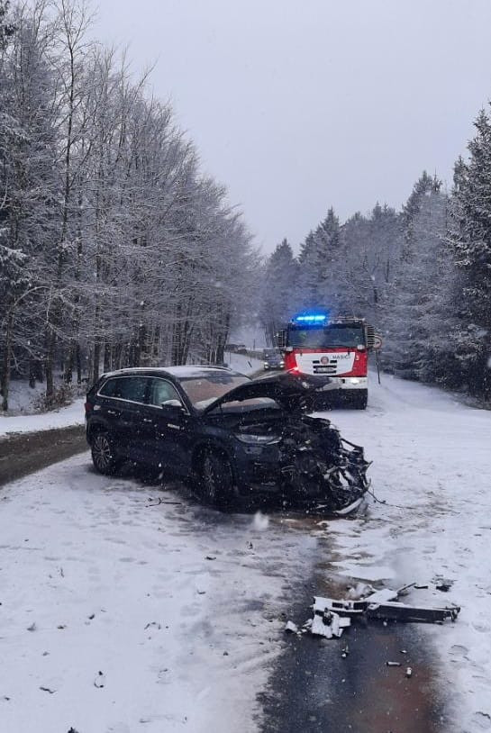 Podmínky na silnicích jsou zrádné. Na silnici I/19 se střetlo osobní a nákladní auto. Foto: Se svolením Policie ČR