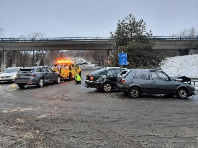 Ledovka na Vysočině: Stalo se dvacet nehod, tři auta bourala na Pelhřimovské v Jihlavě, dva lidé se zranili