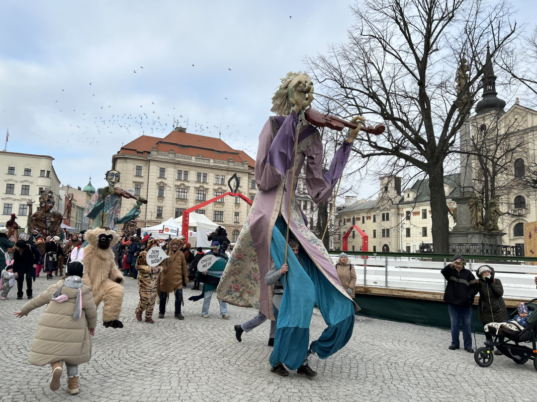 VIDEO: Veselý masopust v centru Jihlavy. V průvodu šla zvířata ze zoo, nadživotní loutky i moderátor v televizi