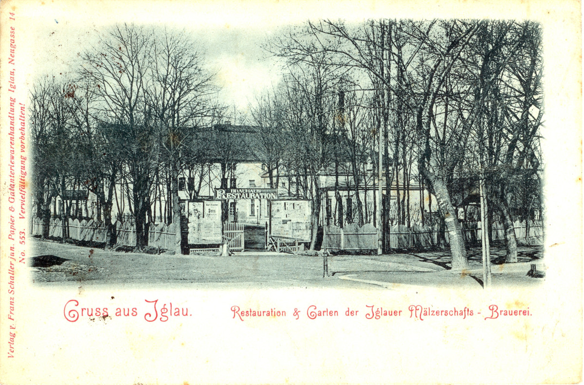 Jihlavský pivovar od jihovýchodu se zahradou. Dobová pohlednice zachycuje podobu pivovaru před rokem 1924. Reprofoto: poskytl Stanislav Jelínek