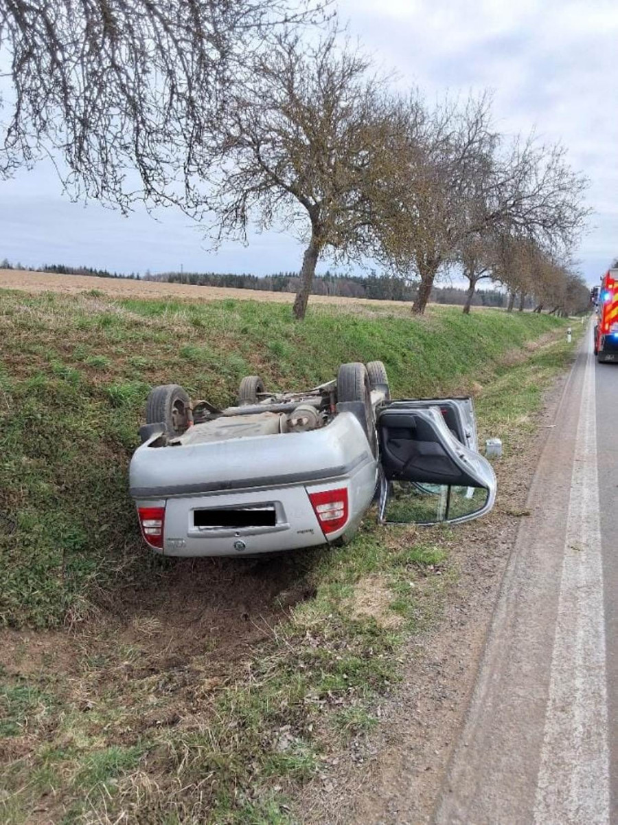 Mladá řidička ráno bourala u Pacova. Nezvládla projet zatáčku, auto skončilo na střeše