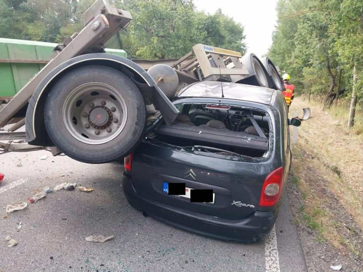 Řidiči nákladní soupravy se rozhoupal vlek. Pak se převrátil na projíždějící auto. Foto: Se svolením Policie ČR