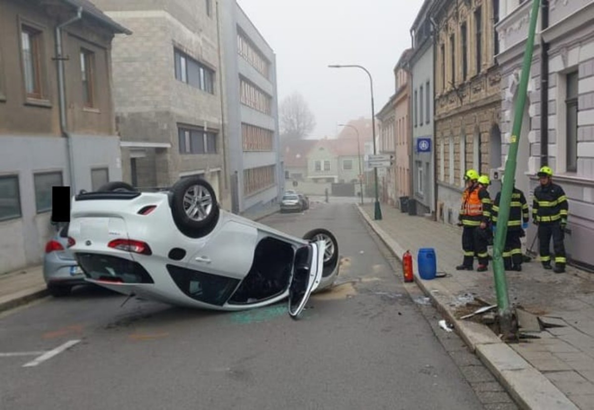 V centru Třebíče ráno skončilo auto na střeše, řidič i jeho spolujezdec se zranili