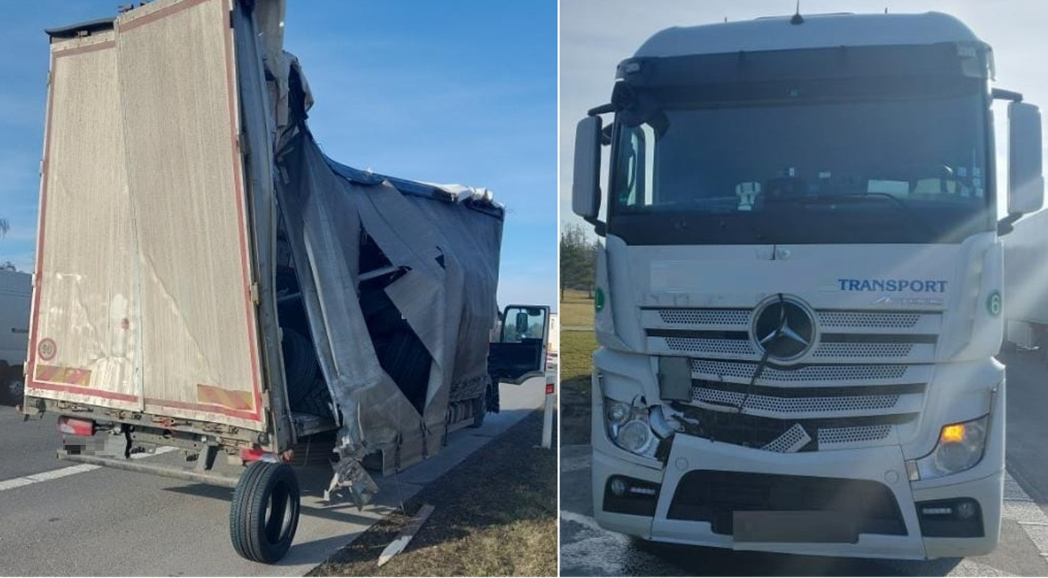 Na dálnici se po nehodě tří kamionů vysypaly pneumatiky, viník měl 0,64 promile. Foto: Se svolením Policie ČR