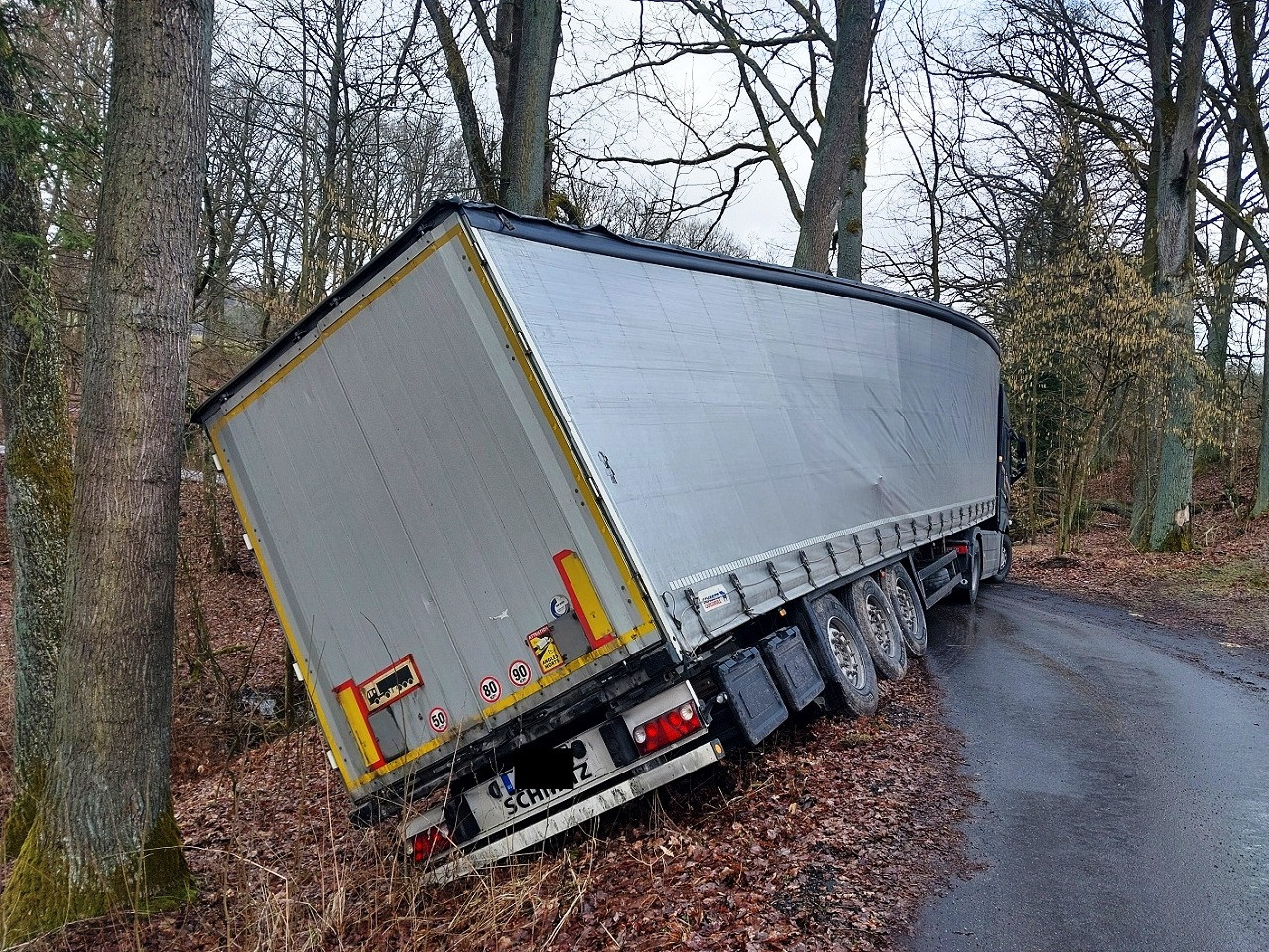 Smolná jízda. U Třeště se pod řidičem utrhla krajnice, návěs sklouzl do příkopu