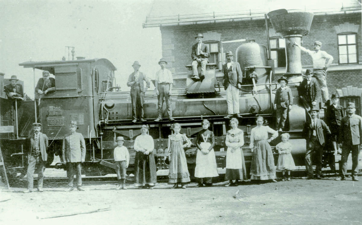 Památeční focení zaměstnanců rakousko-uherské státní dráhy s manželkami a dětmi na vlakovém nádraží Jihlava město. Kolem roku 1900 mezi pracovníky dráhy velmi populární akce.