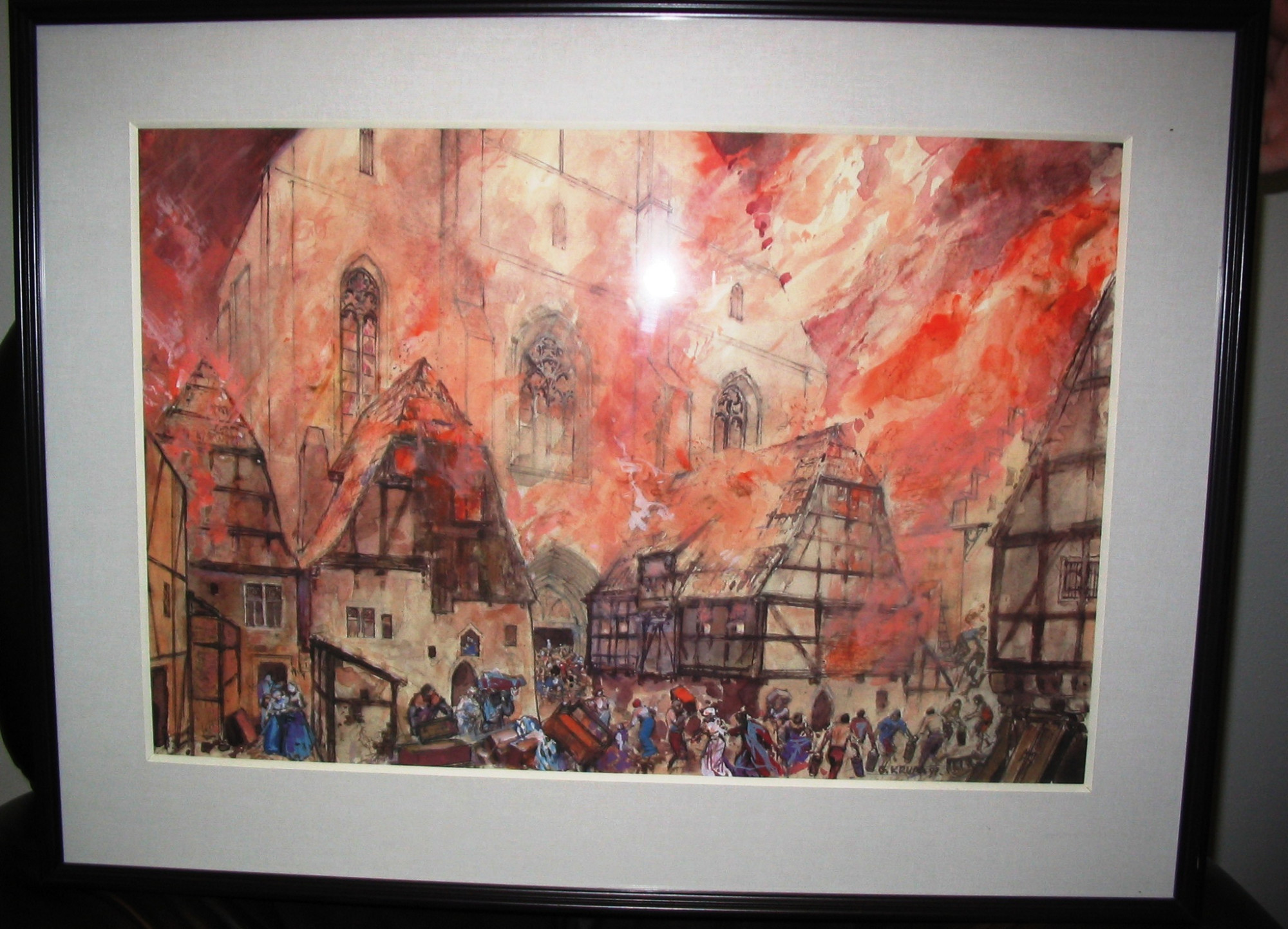 Obraz jihlavského malíře Gustava Kruma s názvem 1525 – Požár gotického města. Reprofoto: publikace Z historie města Jihlavy Obrazy Gustava Kruma