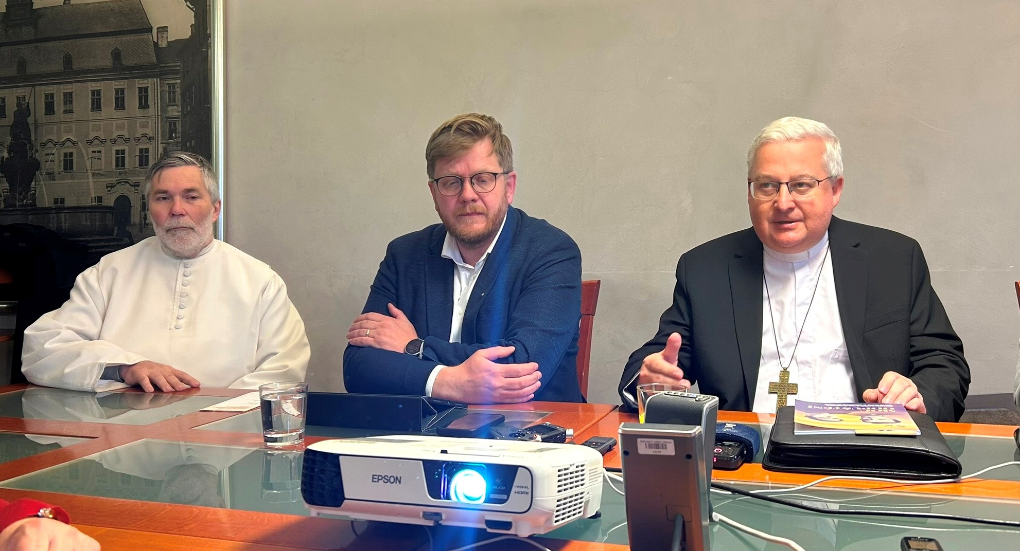 Dnešní tisková konference v Jihlavě. Zleva: Marian Jiří Husek, Petr Piáček, Pavel Konzbul
