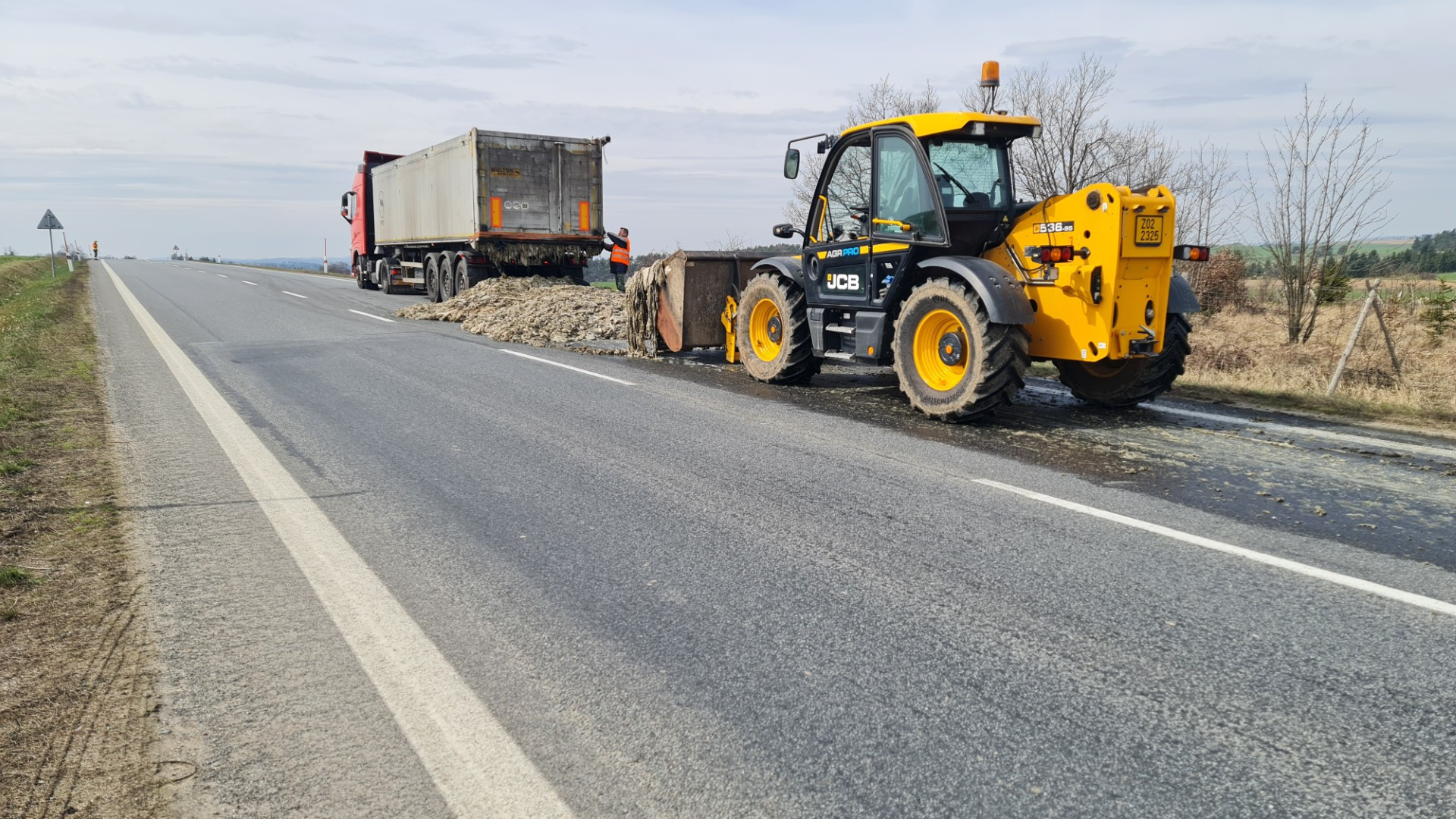 Provoz na frekventované silnici zastavila nehoda, vysypaly se tam kůže zvířat. Foto: ŘSD