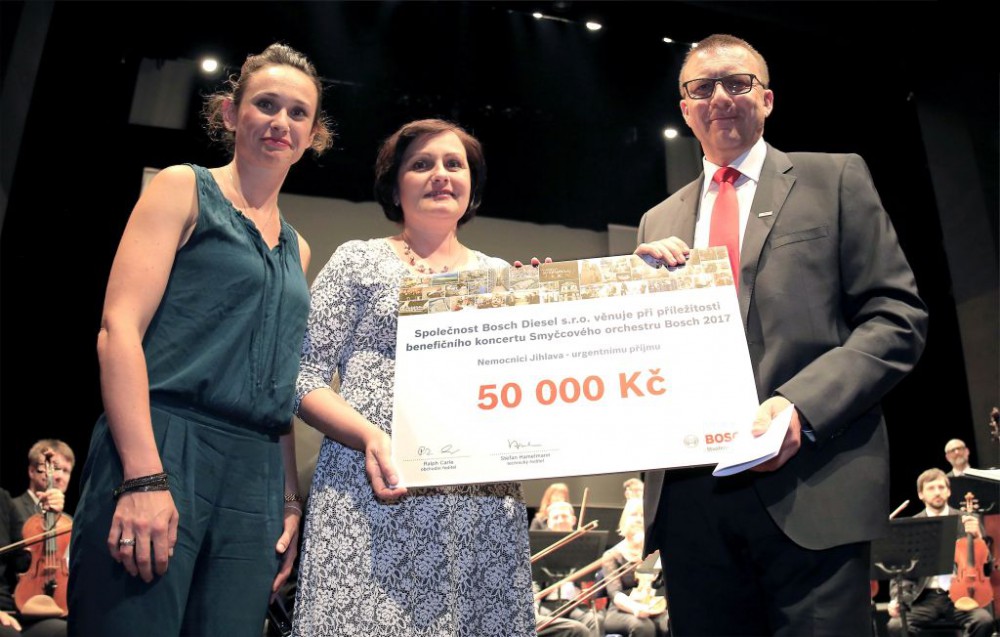 Výtěžek z prodeje vstupenek na benefiční koncert ve výši 50 000 korun půjde na podporu Urgentního příjmu Nemocnice Jihlava. Dar přejímala Hana Hladíková, vrchní sestra Urgentního příjmu Nemocnice Jihlava. Popis zprava doleva: obchodní ředitel firmy Bosch