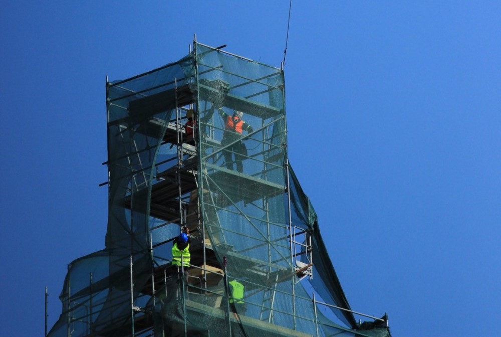 Ukládání trámu na opravovanou věž sv. Ducha v Telči zdržela mlha. Pomáhal vrtulník